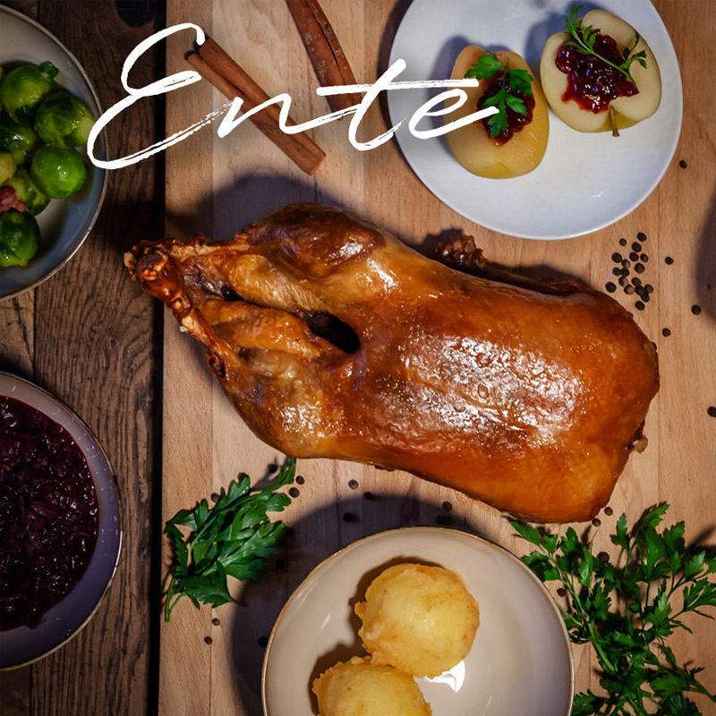 Unsere Enten werden bereits fleißig am Tisch tranchiert – und ab dem 11. November auch ganze Gänse. Für das Festessen Zuhause können ab sofort die To Go Braten inkl. aller Beilagen bestellt werden.