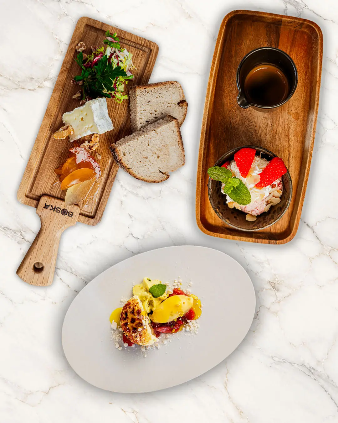 Buttermürbeteig • Frischkäse • Erdbeer-Rhabarber-Kompott • Passionsfruchtsorbet