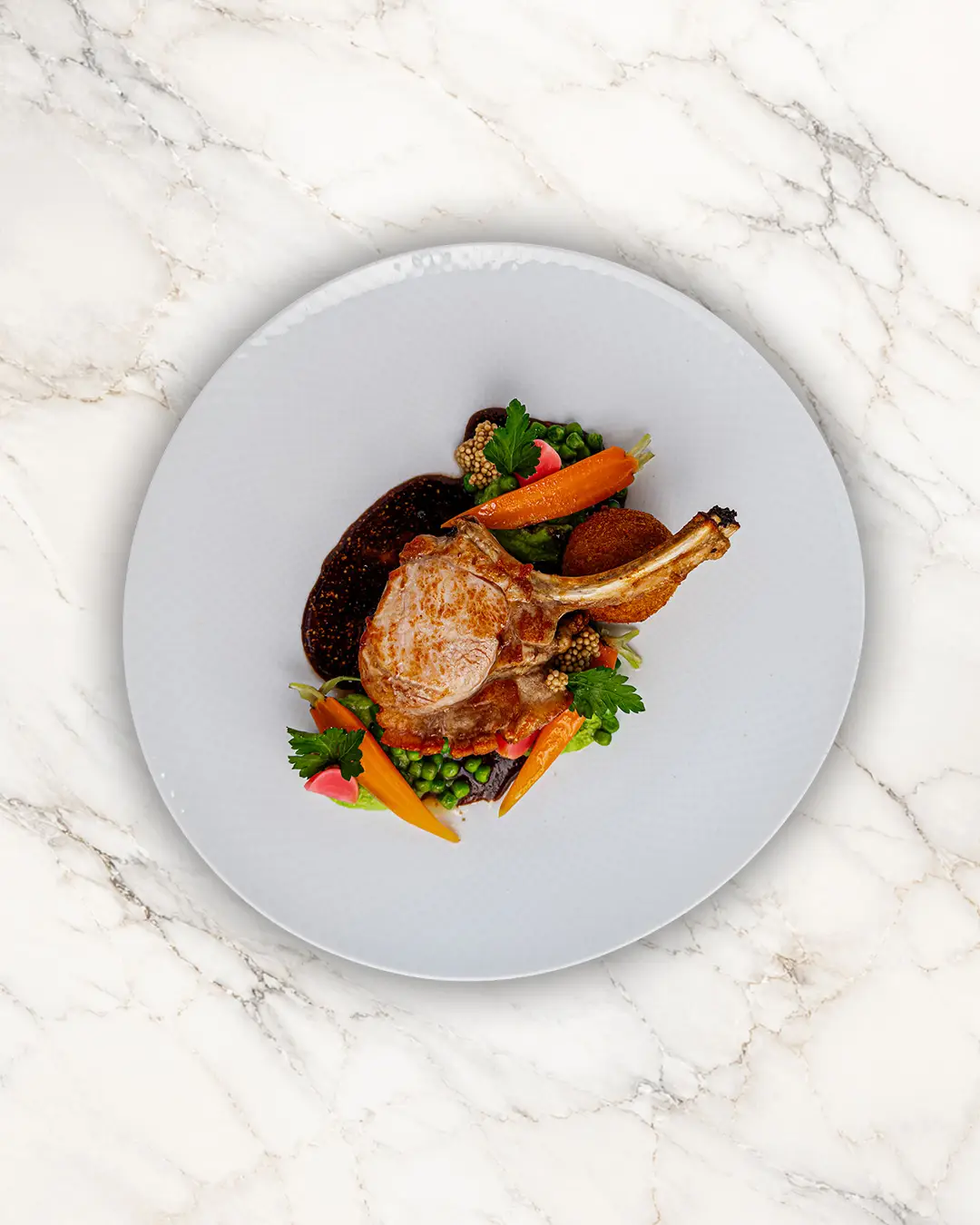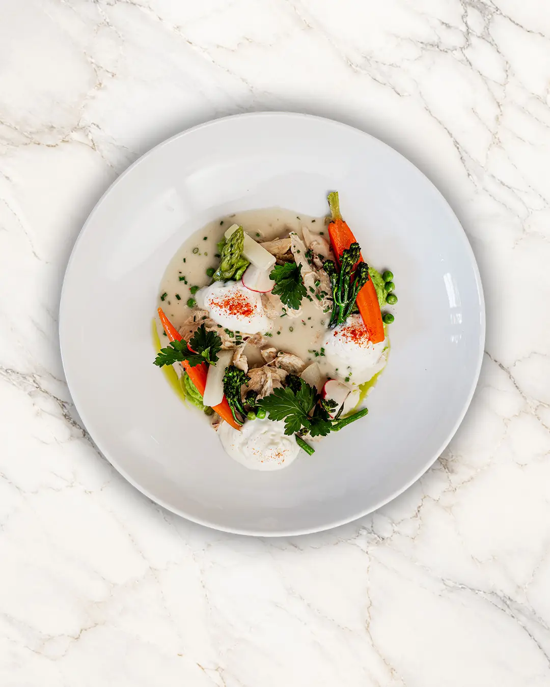 Senfsaatjus • zweierlei Gartenerbse • gepickelte Radieschen • knusprige Grießkrapfen